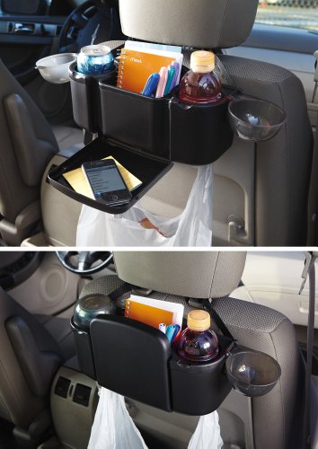 Keep your backseat organized with this backseat organizer. Plastic caddy features two cup holders with a tray that folds out and is ideal for keeping kids occupied during car trips. Tray folds back up when not in use. Easy-clean plastic caddy features a small storage compartment to hold pens, CD"s, maps and papers. Buy two for driver and passenger seats. Fits most cars. 12 1/2"L x 5"W x 6 1/2"H.